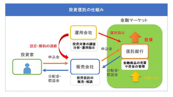 運用会社は、投資家から集めたお金の運用方針を決め、実際の運用指示をします。受託会社は、信託銀行が運用会社の指示で実際の売買、運用、管理をします。信託銀行と運用会社が独立しているので、お金は守られ、ルールに従って投資信託が運用されるのです。